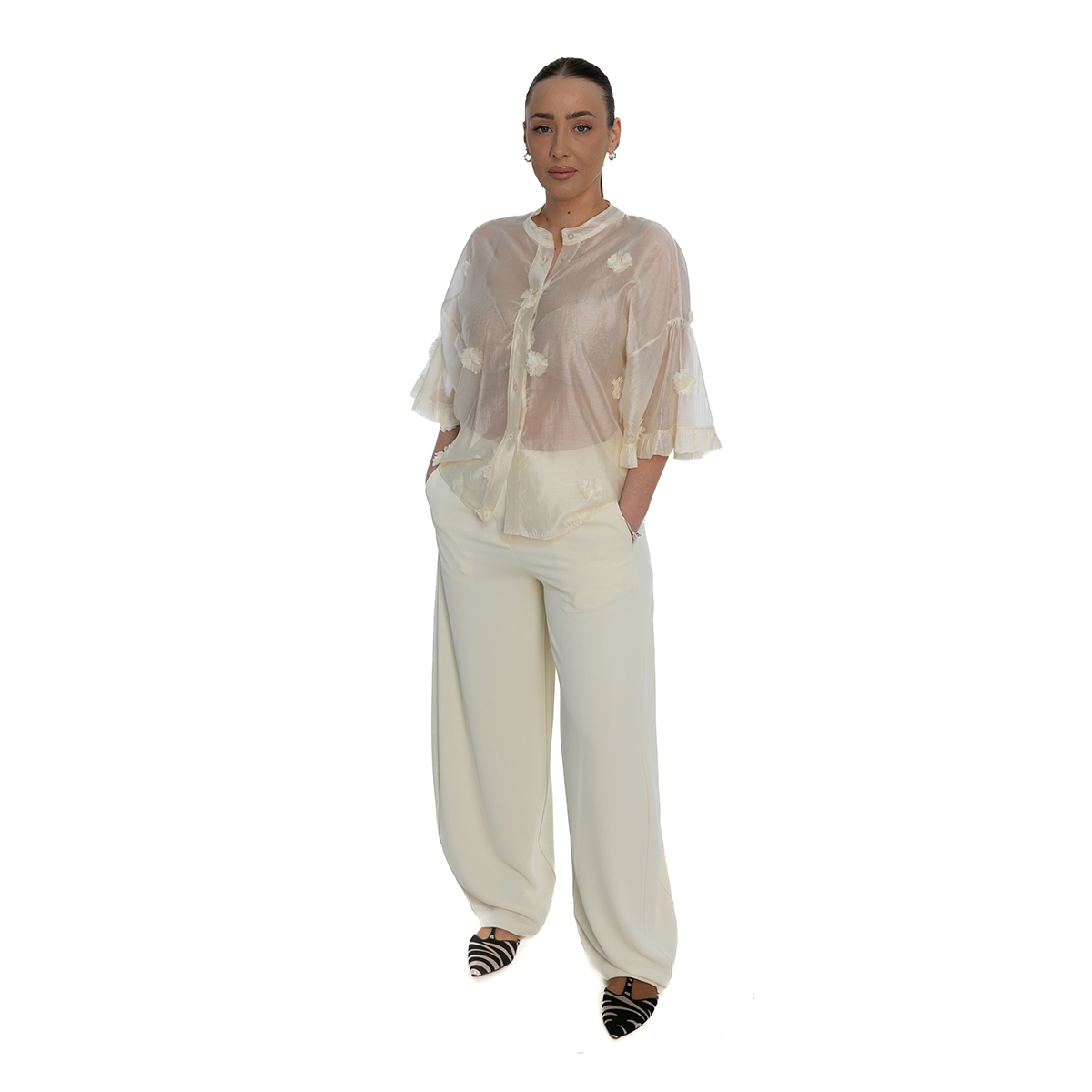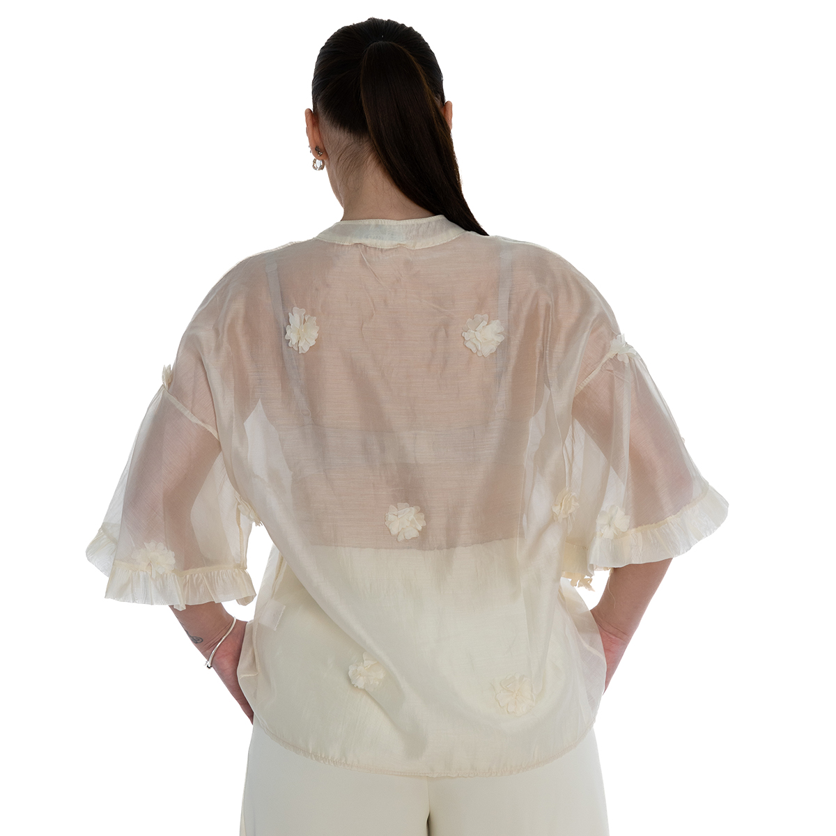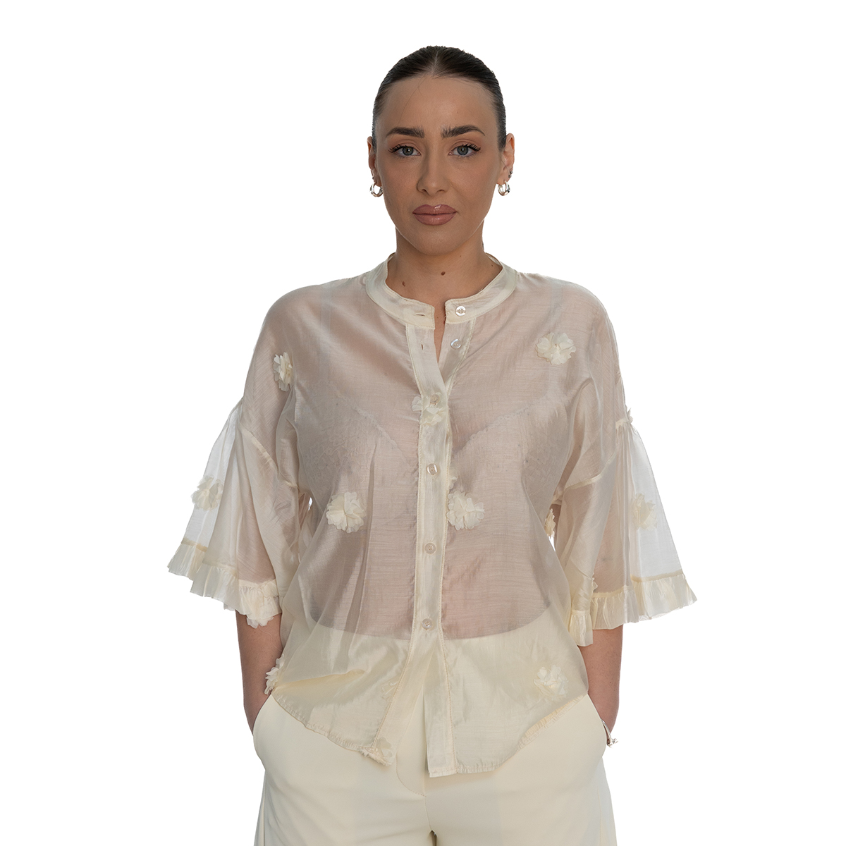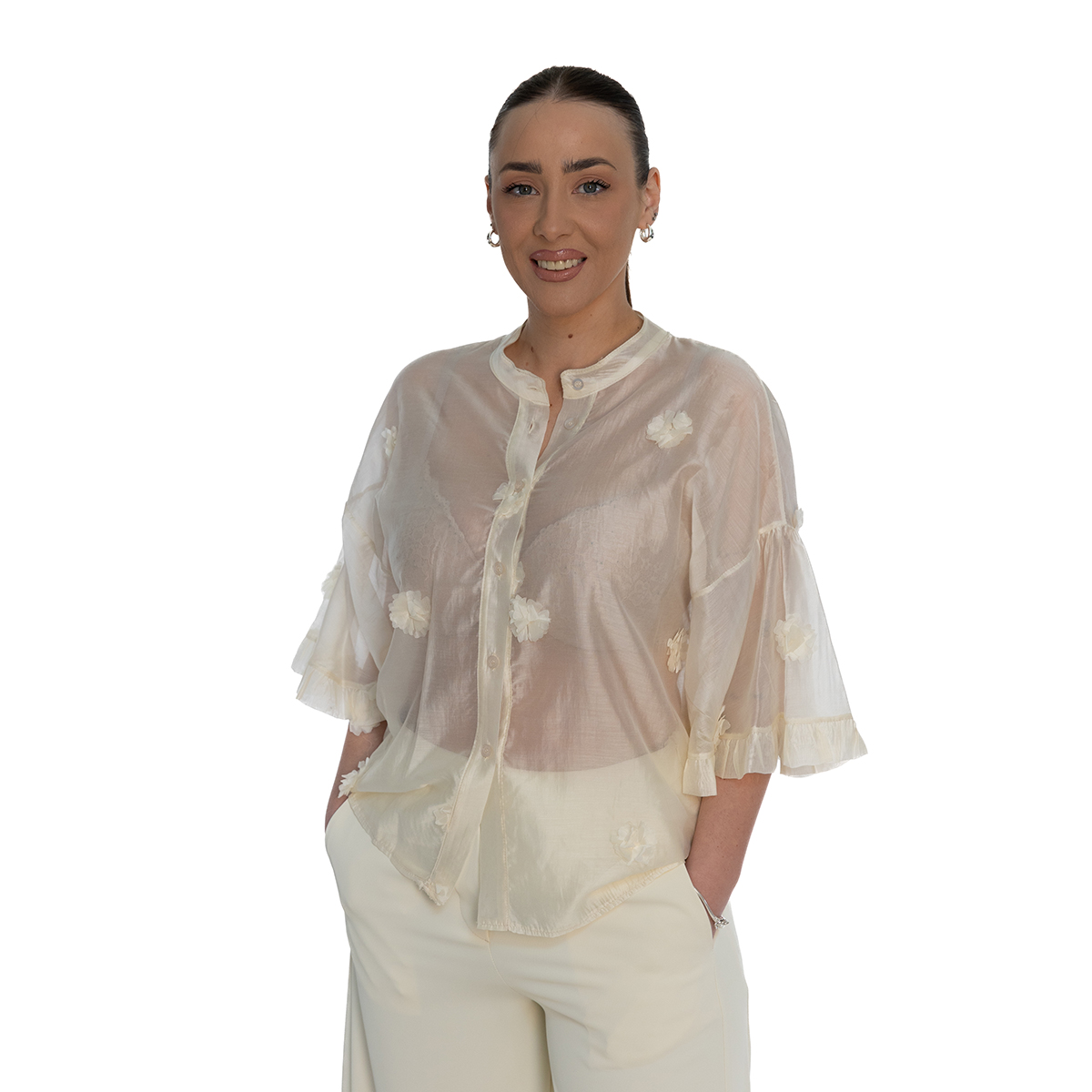 ΕΛΑΦΡΥ-ΗΜΙΔΙΑΦΑΝΟ ΠΟΥΚΑΜΙΣΟ ΑΠΑΛΗ ΑΕΡΙΝΗ ΥΦΗ ΜΕ ΔΙΑΚΡΙΤΙΚΗ ΓΥΑΛΑΔΑ ΔΙΑΚΟΣΜΗΣΗ ΜΕ ΑΝΑΓΛΥΦΑ ΤΡΙΑΝΤΑΦΥΛΛΑ ΣΕ ΟΛΟ ΤΟ ΥΦΑΣΜΑ ΧΑΛΑΡΗ ΚΑΙ ΑΝΕΤΗ ΓΡΑΜΜΗ ΚΟΝΤΑ ΜΑΝΙΚΙΑ ΜΕ ΒΟΛΑΝ ΚΑΙ ΚΙΝΗΣΗ ΣΤΡΟΓΓΥΛΗ ΛΑΙΜΟΚΟΨΗ ΜΕ ΚΟΥΜΠΙΑ ΜΠΡΟΣΤΑ